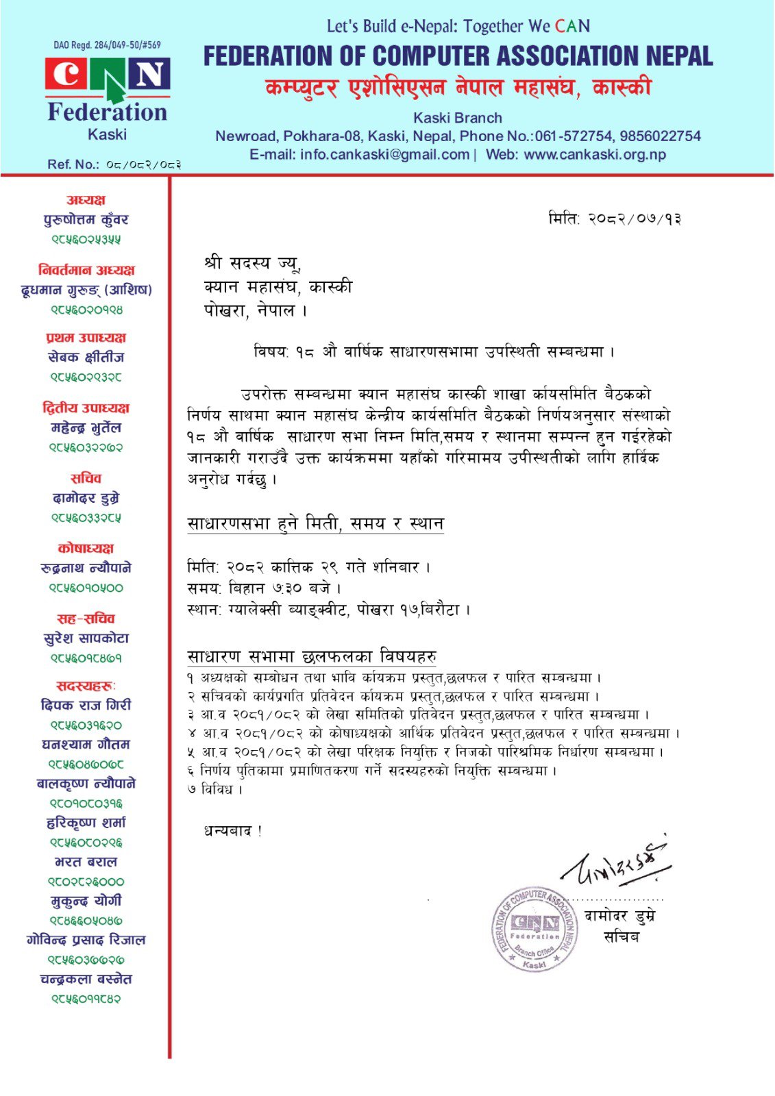 Computer Association of Nepal (CAN) was formed in May 1992 but was formally registered in December 1992 and later registered as Federation of Computer Association Nepal (CAN Federation) in January 2015 with the involvement of professionals, specialists, institutions and related organizations from the Information Communication Technology sector in Nepal.